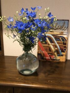 今度は、少し場所を変えて飾ってみました。後ろの「Sunny Beach」のプレートとデルフィニウムの青が、なんとも爽やかな組み合わせ!まるで海辺のカフェにいるような気分になります。