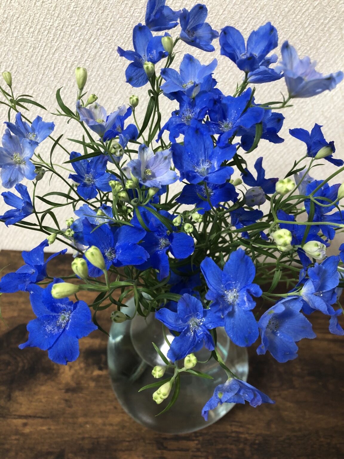 飾っているのは、落ち着いた木目調のテーブルの上。シンプルな背景と組み合わせることで、デルフィニウムの鮮やかな青色がより際立ち、まるで絵画のワンシーンのようです。