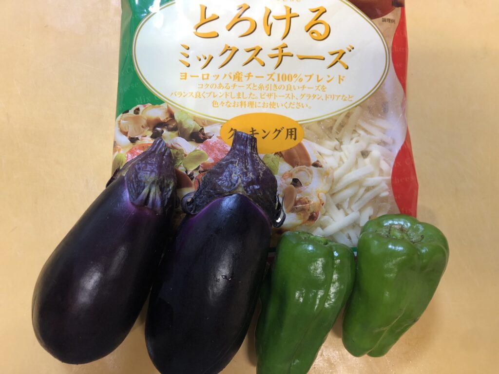 まずは、今日の戦士たちをご紹介。ナスとピーマン、そして秘密兵器のチーズです。
