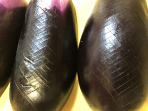 「味が、味が染み込むんだよ!これで深みが段違いなんだ!」と、ブツブツ言いながらナス全面に切れ目を入れました。これは、オヤジの執念とドヤ顔への布石です。