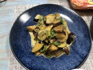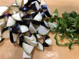 ふざけるな、オヤジだって料理くらいするわい! という謎の対抗心(女性相手にみっともないぞ!笑)に火がつき、急遽「ナスピーポン酢炒め」で勝負を仕掛けることにしました。