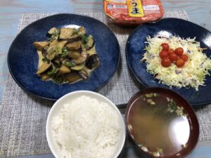 炒め物だけでなく、ご飯、お味噌汁、サラダまで完璧に揃ったディナープレート。