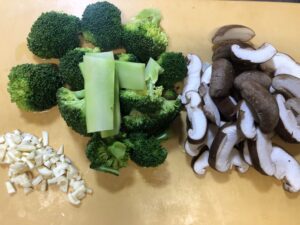 下準備は、ブロッコリーを小房に分け、シイタケをスライス、ニンニクを粗みじんに。ブロッコリーの芯も皮を厚めに剥いてスライスし、無駄なく使いました。