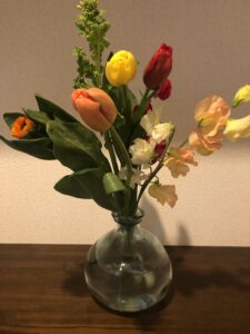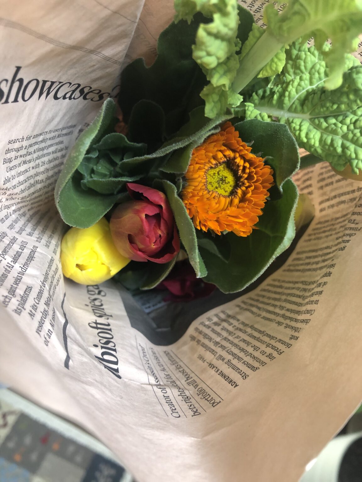 今朝も、いつものように英字新聞に丁寧に包まれた小瓶用の花束が届きました。 慎重に包みを解くと、現れたのは春のオールスターたち。