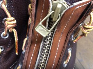 そして最近、遊び心でカスタムを楽しんでいるのが、深みのあるダークブラウンが魅力の「8138」です。 このブーツには、純正のジッパーユニットを装着しています。巷では汎用的なYKKのユニットを見かけることもありますが、私がこだわったのはジッパーヘッドに「RED WING」の刻印が入っていること。これがあるだけで、カスタム品でありながらブランドの正統な血統を感じさせてくれる、譲れないポイントなのです。