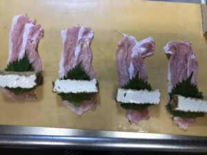 いよいよ巻く作業です。豚ロースを広げて、大葉を乗せ、厚揚げを置きます。