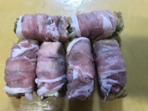 大葉がはみ出ていますが、気にせず、とにかく豚ロースで全体を包み込むように巻いていきます。肉が薄いので、厚揚げの白さが透けて見えますね。