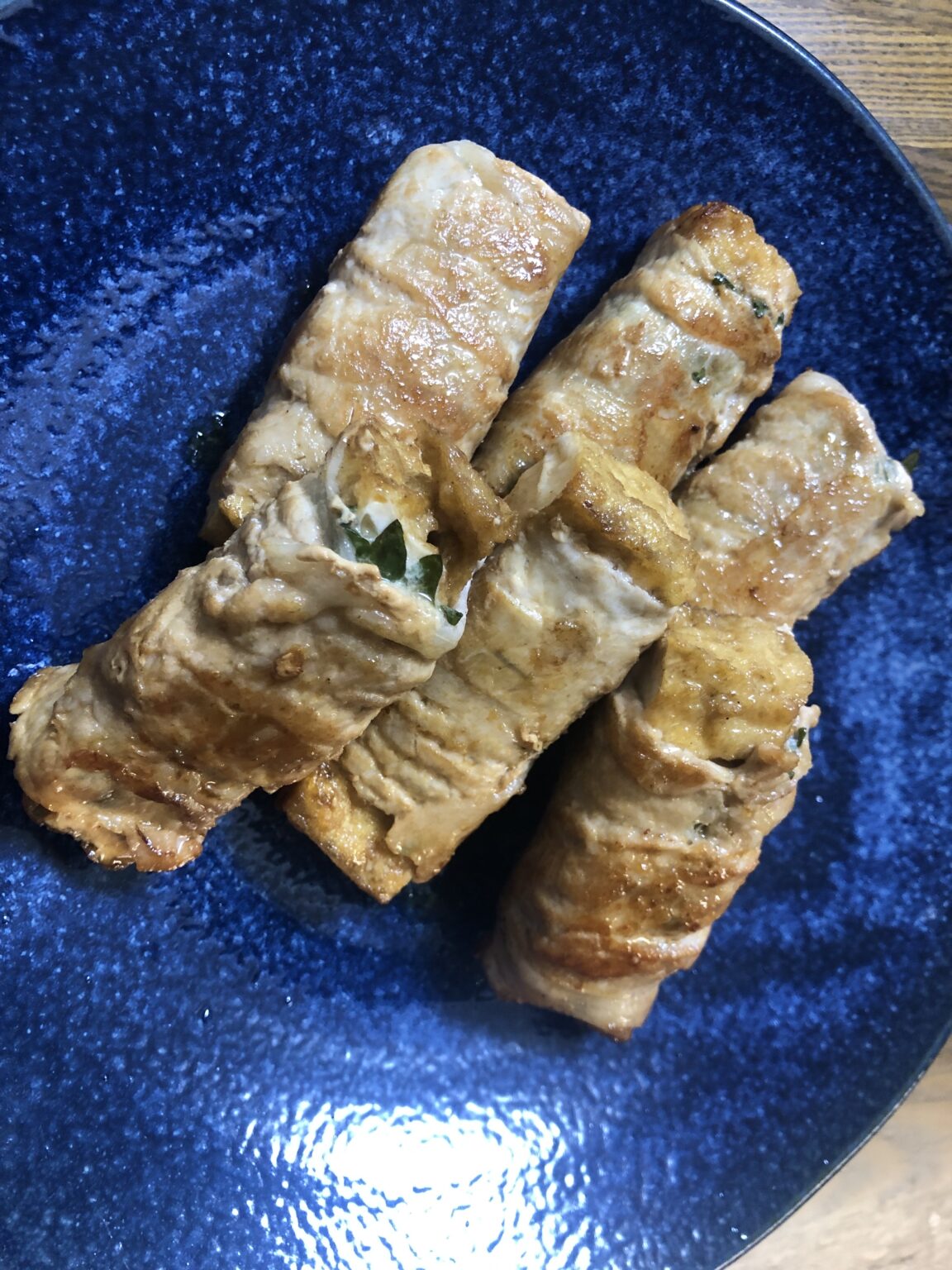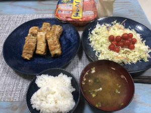 「豚ロースで大葉と厚揚げを巻いたの作ったんだけど。簡単だよ。味付け?めんつゆにすりおろしニンニク入れるだけ。それだけ。」