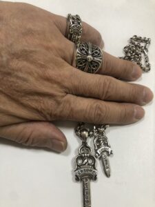 実はこれ、娘の旦那さんから頂いたものなんです。 さらに、首元や指先で存在感を放っているのは、同じく彼から頂いた**Chrome Hearts(クロムハーツ)**の数々。