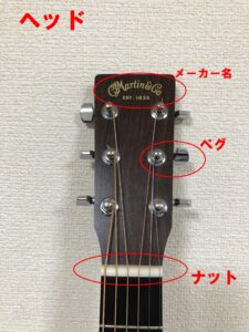 - メーカー名:ヘッドの正面(天神板)に刻まれているブランドロゴです。画像では、1833年創業という長い歴史を持つ世界最高峰のギターメーカー「C.F. Martin & Co.」のロゴが確認できます。このロゴのデザインは年代やシリーズによっても異なり、ファンの注目ポイントとなります。