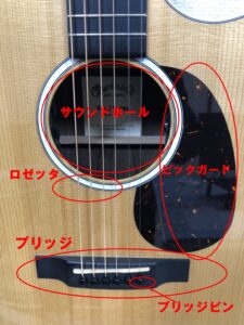 - サウンドホール (Sound Hole):ボディ中央に開けられた大きな穴です。弦の振動によってボディ内部で増幅された音が、ここから豊かな響きとなって放出されます。また、ピックアップが搭載されたモデル(エレアコ)では、内部のコントロール類を操作する入り口にもなります。