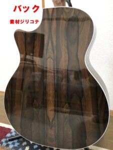 - バック (Back):ボディの背面(裏板)です。トップで生まれた振動を反射させ、音を整える役割があります。画像にあるGPC-13Eのバック材は「ジリコテ」という非常に希少で美しい木目を持つエキゾチックウッドが使用されており、深みのある低音と高級感のあるルックスを両立しています。